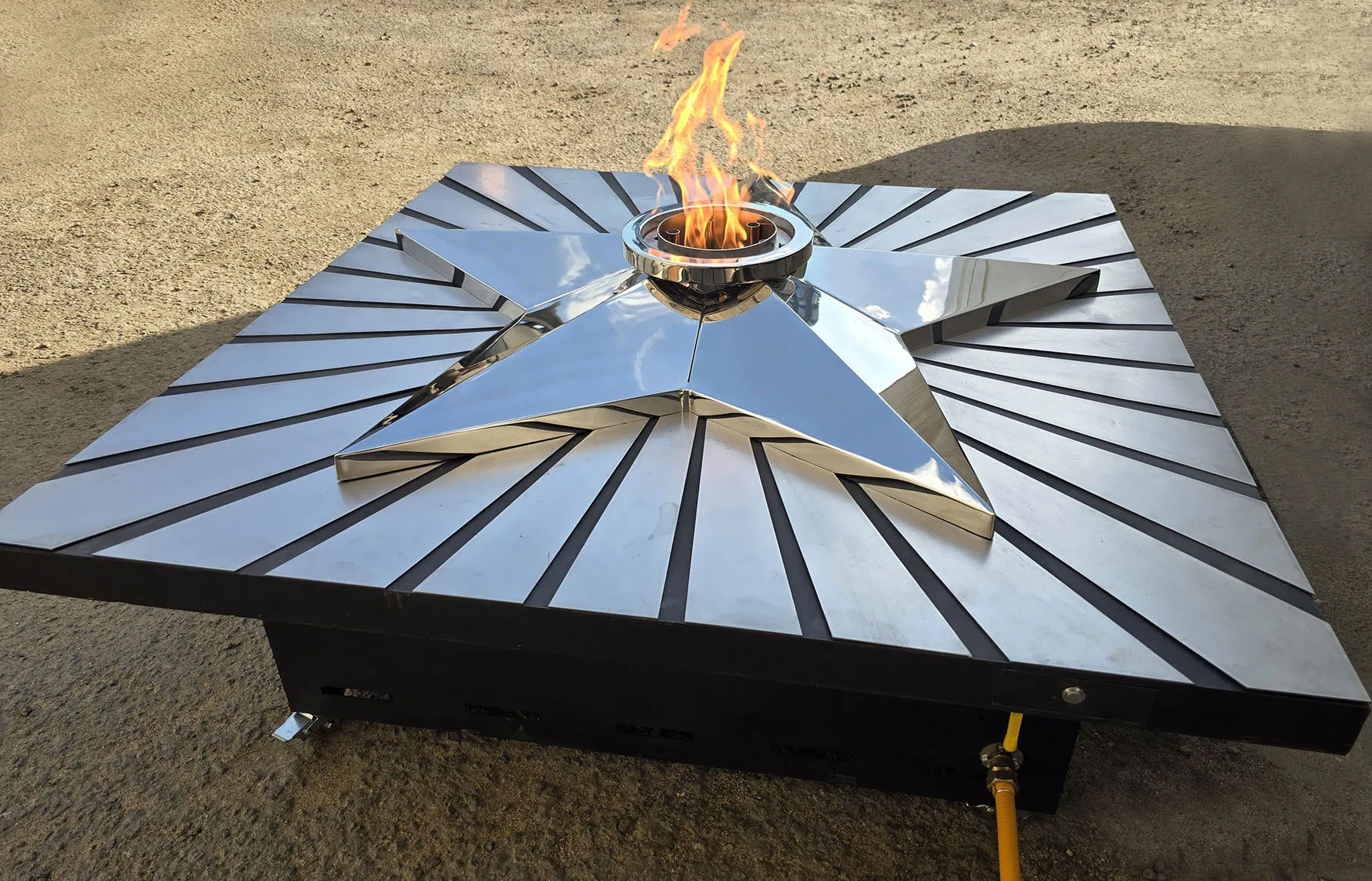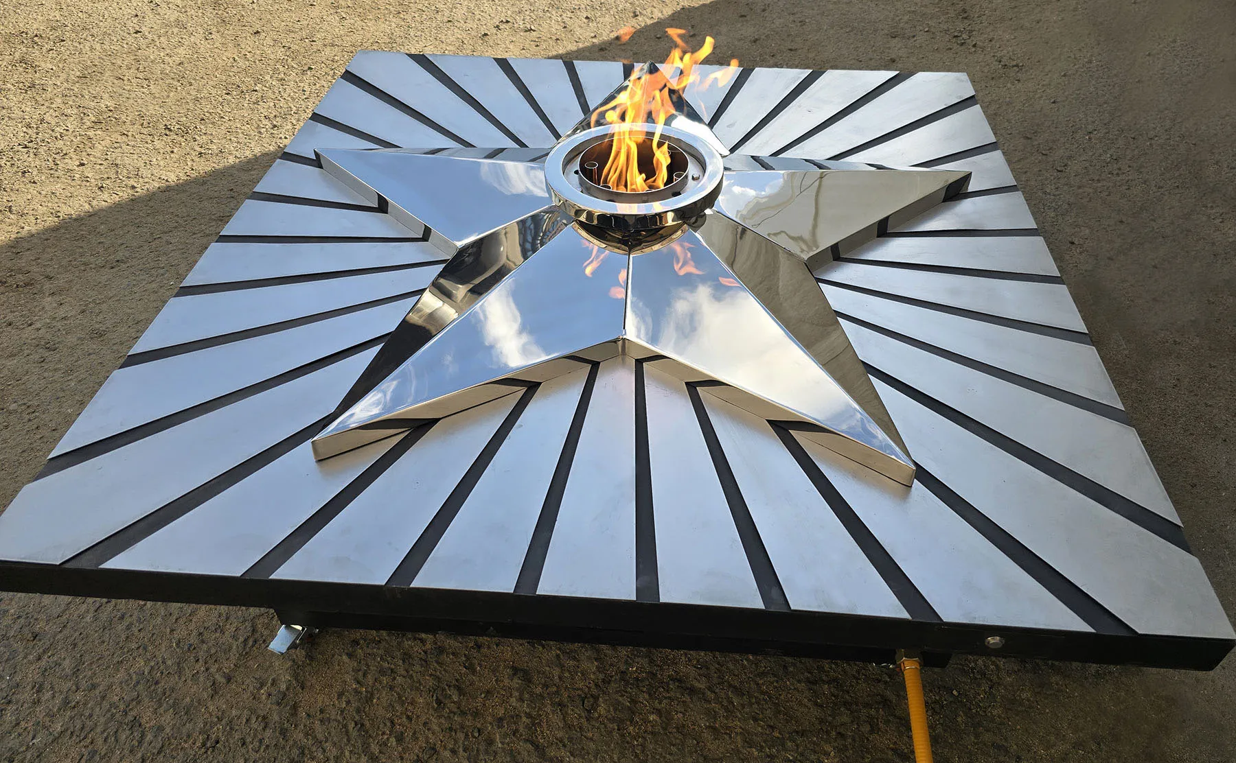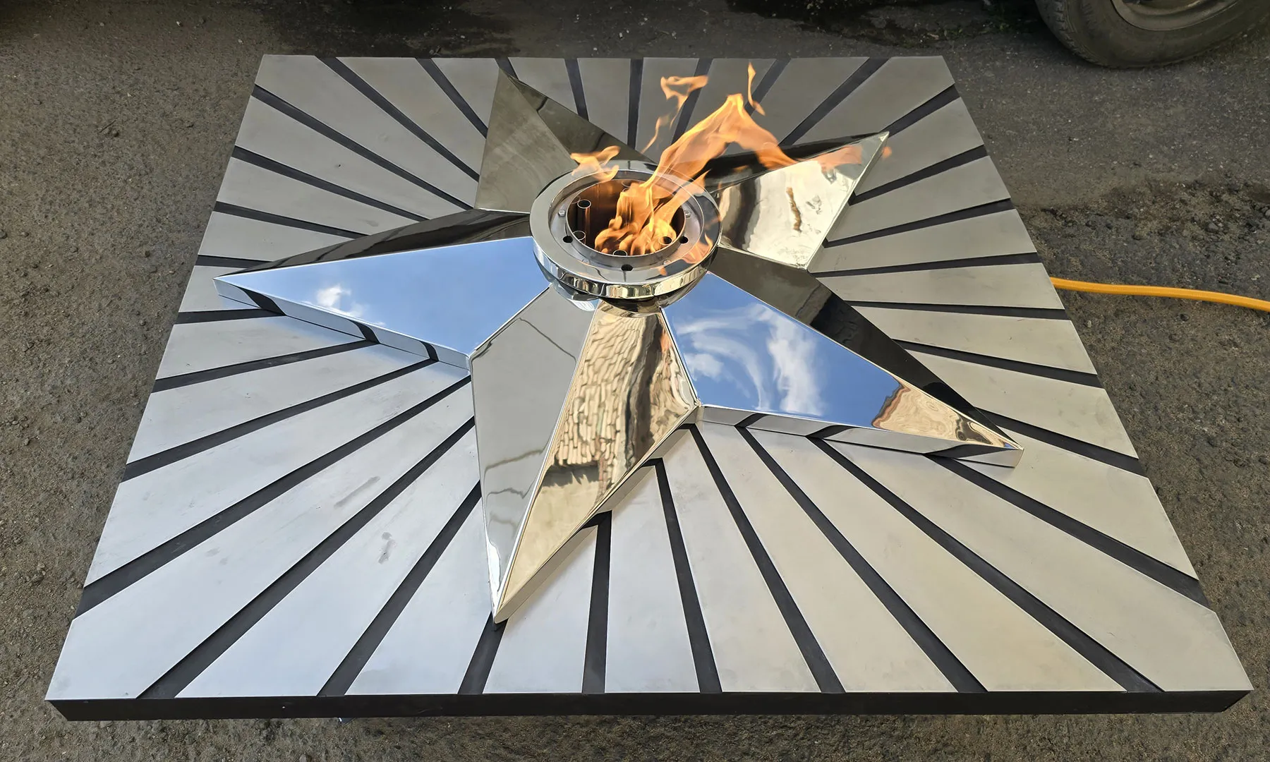 Мобильная группа оборудования «Вечный огонь» - это действующая модель настоящего вечного огня. Компактные размеры и небольшой вес позволяют использовать изделие в формате выездного мероприятия. Высота пьедестала 350 миллиметров, габариты пьедестала по верхнему срезу 1200 хь1200 мм. Модель оснащена устройством искрового розжига пламени, работает розжиг по нажатию пусковой кнопки на передней панели изделия. Топливо – сжиженный газ (пропан), гибкая линия подвода газа позволяет вынести баллон с газом на расстояние до 50 метров от места расположения самого мобильного модуля. Оборудование сертифицировано, безопасно и функционально. Для работы модуля используется газовая ветроустойчивая горелка модели ГВД 379 10 89 00 ПС. Изделие производится и поставляется в продажу группой компаний NSO-PiroClub